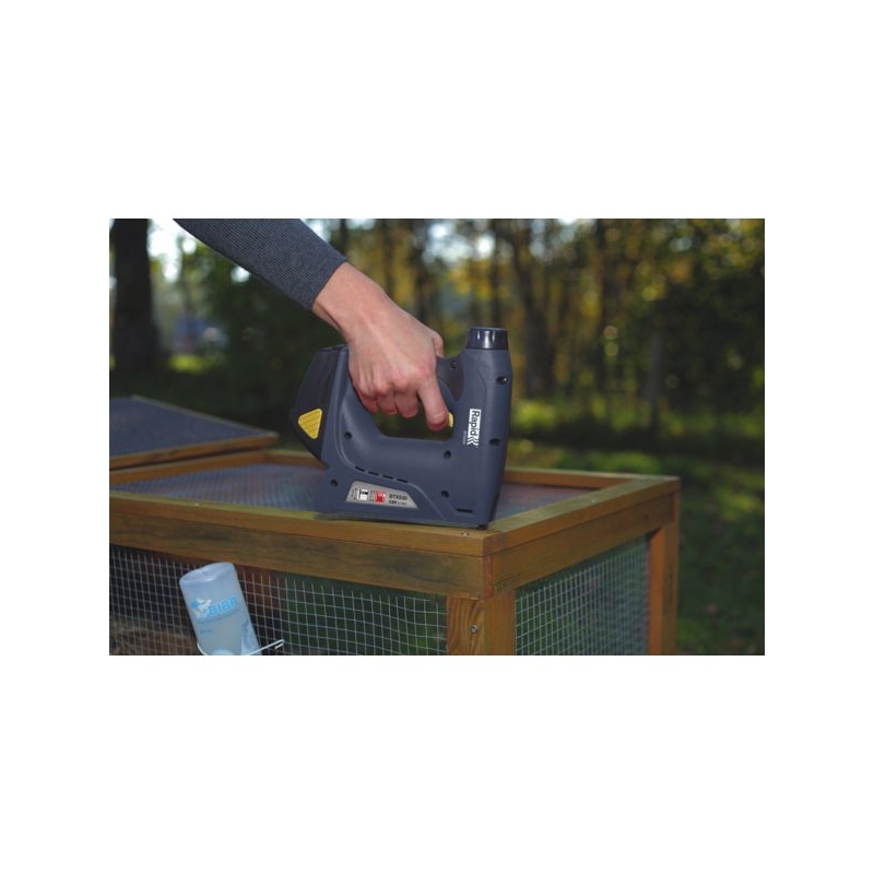 Pour textile, cuir, petite menuiserie, étiquetage, tissu d’ameublement, tapisserie. Utilise des agrafes n°53 de 6 à 14 mm et des pointes n°8 de 15 mm. Livrée dans une mallette avec une batterie déjà chargée pour deux heures et demi d’utilisation.