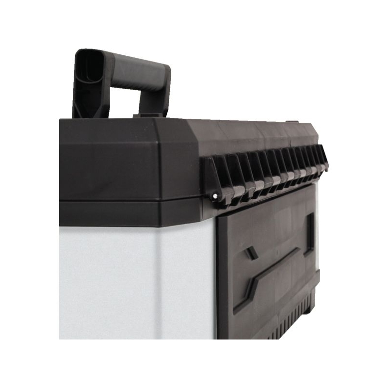 Ossature métallique et polypropylène. Larges attaches métalliques. Plateau porte-outils 3/4 intégré. Rainure en V sur le couvercle pour découpe d'appoint. Cadenassable. Livrée sans outils.