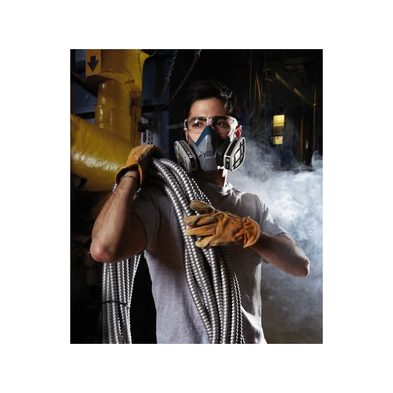 En silicone. Équipé d'une soupape expiratoire centrale. Confortable, léger, entretien facile. À équiper de filtres latéraux fixés par système 'Click' à baïonnette. Harnais ajustable. Mise en place et retrait aisé lors de l'entrée ou de la sortie d'une zone contaminée, grâce au système Quick Latch. Polyvalence d'emploi : filtres antigaz et/ou à particules Taille : M Norme : CE Cat III - EN 140