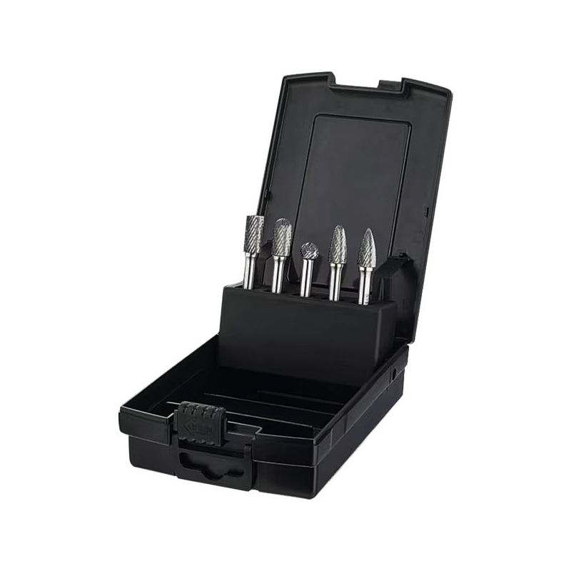 Fraise Ø 10 mm, carbure monobloc. Queue cylindrique 6 mm. Coupe à droite. Composé de : forme B, forme cylindrique avec denture en bout. forme C, forme cylindrique à bout arrondi forme D, forme sphérique forme F, forme ogive à bout arrondi forme G, forme ogive