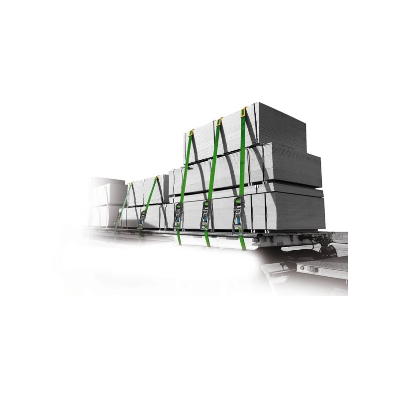 Arrimage 2 parties avec tendeur à cliquet inversé permettant une force d'arrimage maximale sans effort. Avec le tendeur traditionnel, il faut soulever le levier pour tendre la sangle. Sur le tendeur inversé, il suffit de baisser le levier pour effectuer la tension. TMU : 2500 kg Rupture de sangle : 7,5 t Longueur/largeur : 9 m/50 mm Norme : EN 12195-2