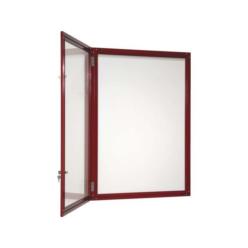 Vitrine réversible avec fond tôle laquée électrozinguée (affichage magnétique). Porte battante démontable avec charnière inox. Encadrement aluminium anodisé, façade verre Sécurit 4 mm. Fermeture par serrure dans le vitrage. Fixation murale 4 points. Épaisseur hors-tout : 35 mm Épaisseur utile : 21 mm Existe en noir, gris et rouge.
